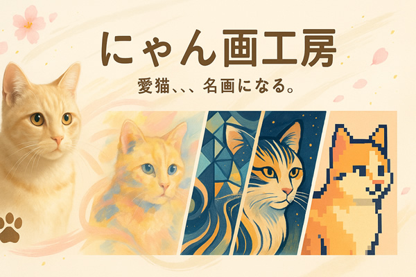 にゃんこ × アートの新体験。スタイル選択で、油絵・水墨・ドット絵などに変身。背景や世界観はガチャ。あなたの“うちの子”を世界でひとつの名画へ。